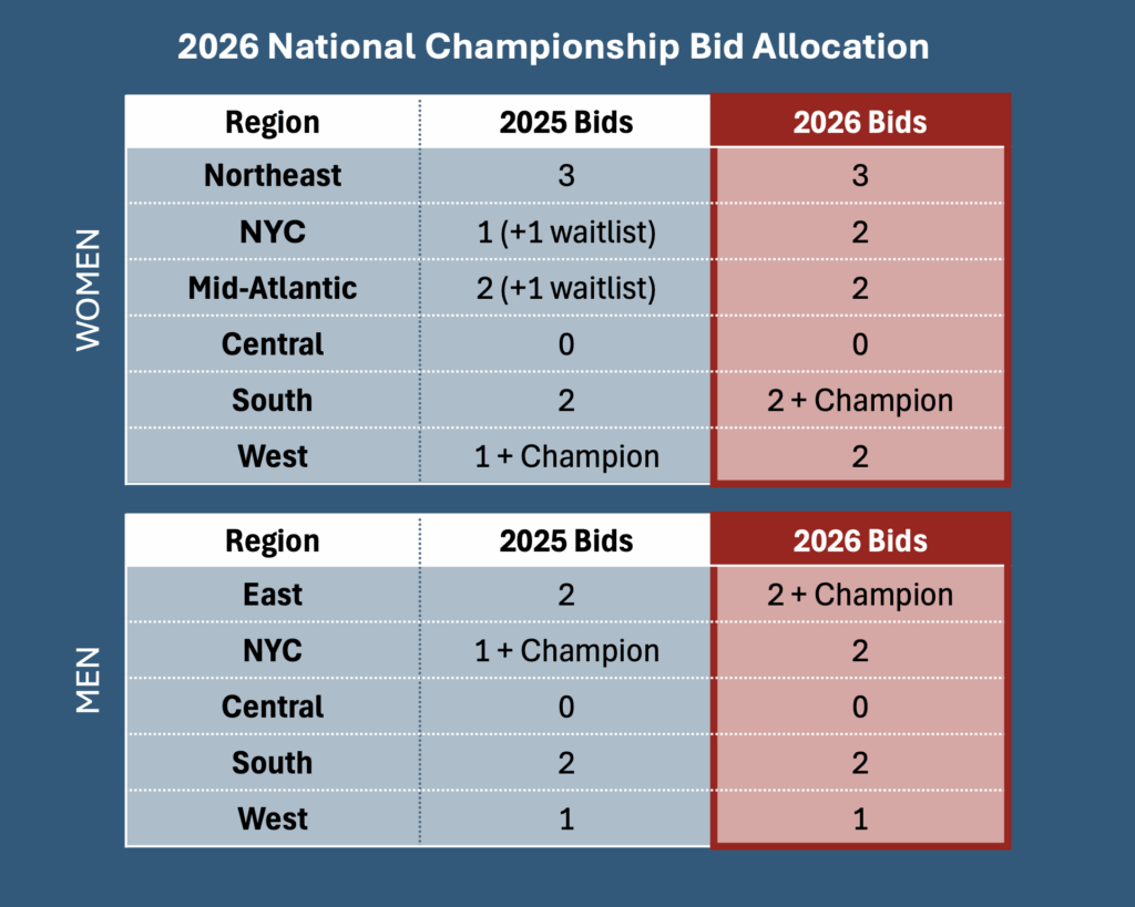 Each Region has been allocated a number of bids to Nationals that teams can compete for via the qualifying events (RCC or NEFHA League). The number of total bids allocated to each region for men and women is based on the concentration of teams in the region and on the overall region's performance at USFHL Championship Pathway events.